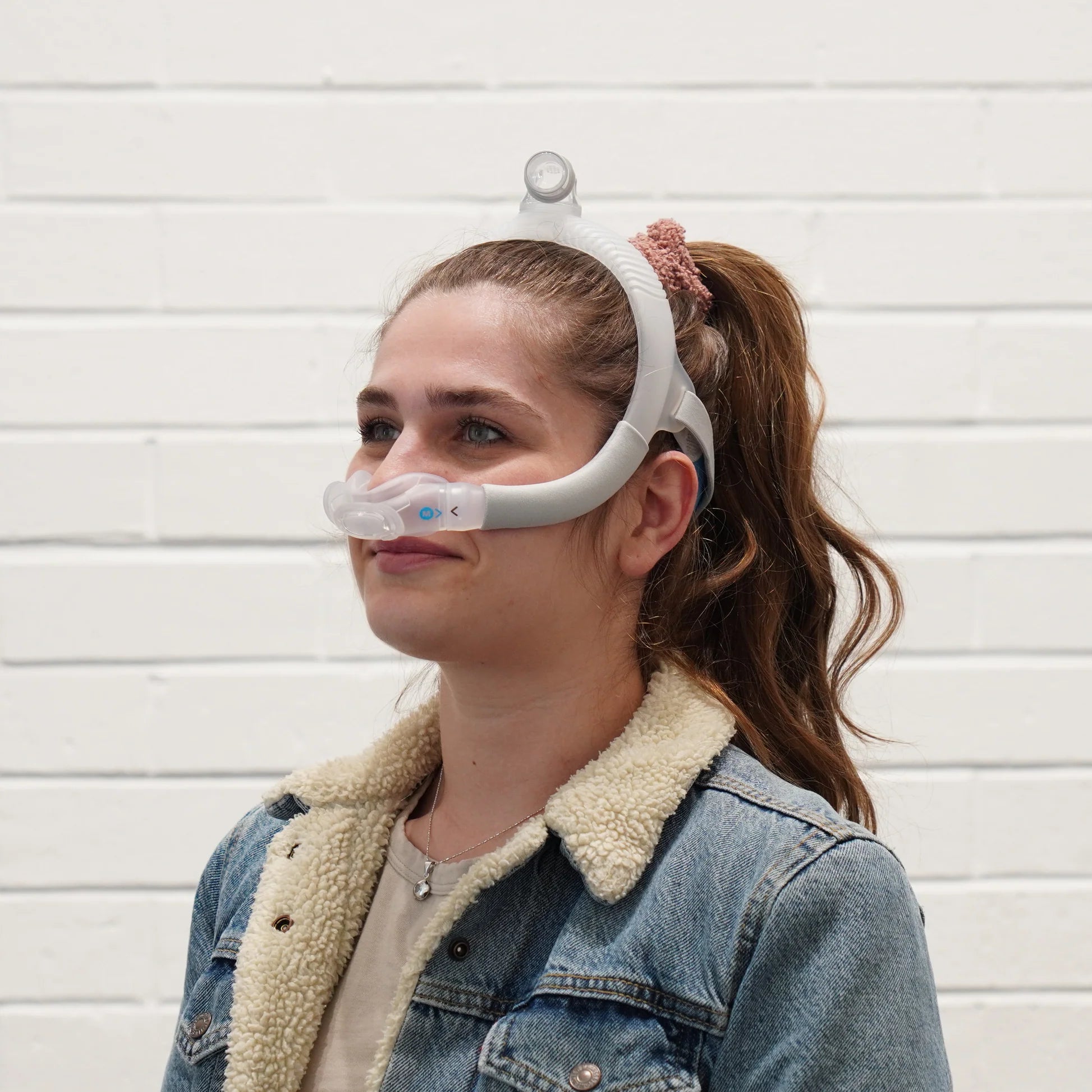 The AirFit N30i delivers nasal pillow therapy with top-of-the-head tube connection.